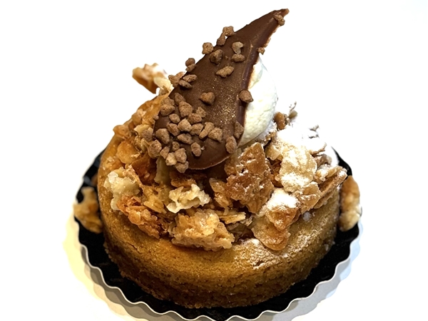 Zanddeeg bodem met appel en room gebakken op gespoten met luchtige kaneel mousse en krokante amandeltjes.